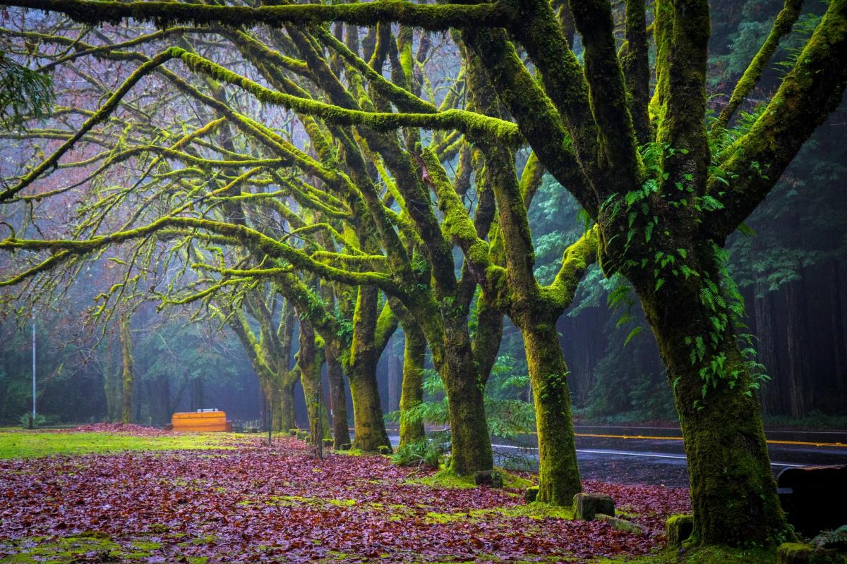 Besides the coast redwood, other common trees in the redwood forest are Douglas Fir, Tan Oak, Big-Leaf Maple, Pepperwood, and Madrone. Douglas Fir and Tan Oak trees are quite common and are found throughout the park. They can tolerate a variety of conditions, so these trees grow in the moist areas amongst the redwoods as well as the drier slopes where mixed forests are common. Douglas Fir trees are the second largest trees in the coast redwood forest and they are sometimes confused with redwoods. Tan Oaks are also common throughout the park; they are not true oaks, but they do produce acorns. Tan Oak acorns have bristly caps, which help set them apart from true oaks. Both Big-Leaf Maple and Pepperwood trees are found in redwood groves as well as upland slopes. Conditions are drier in upland slope areas, and these are places where mixed forests are often seen.